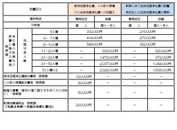 店舗または店舗併用住宅に合併処理浄化槽を設置する場合 | 合併処理浄化槽の設置および取得に要する費用(流入、放流に係る管渠および桝に係る費用を除く) |