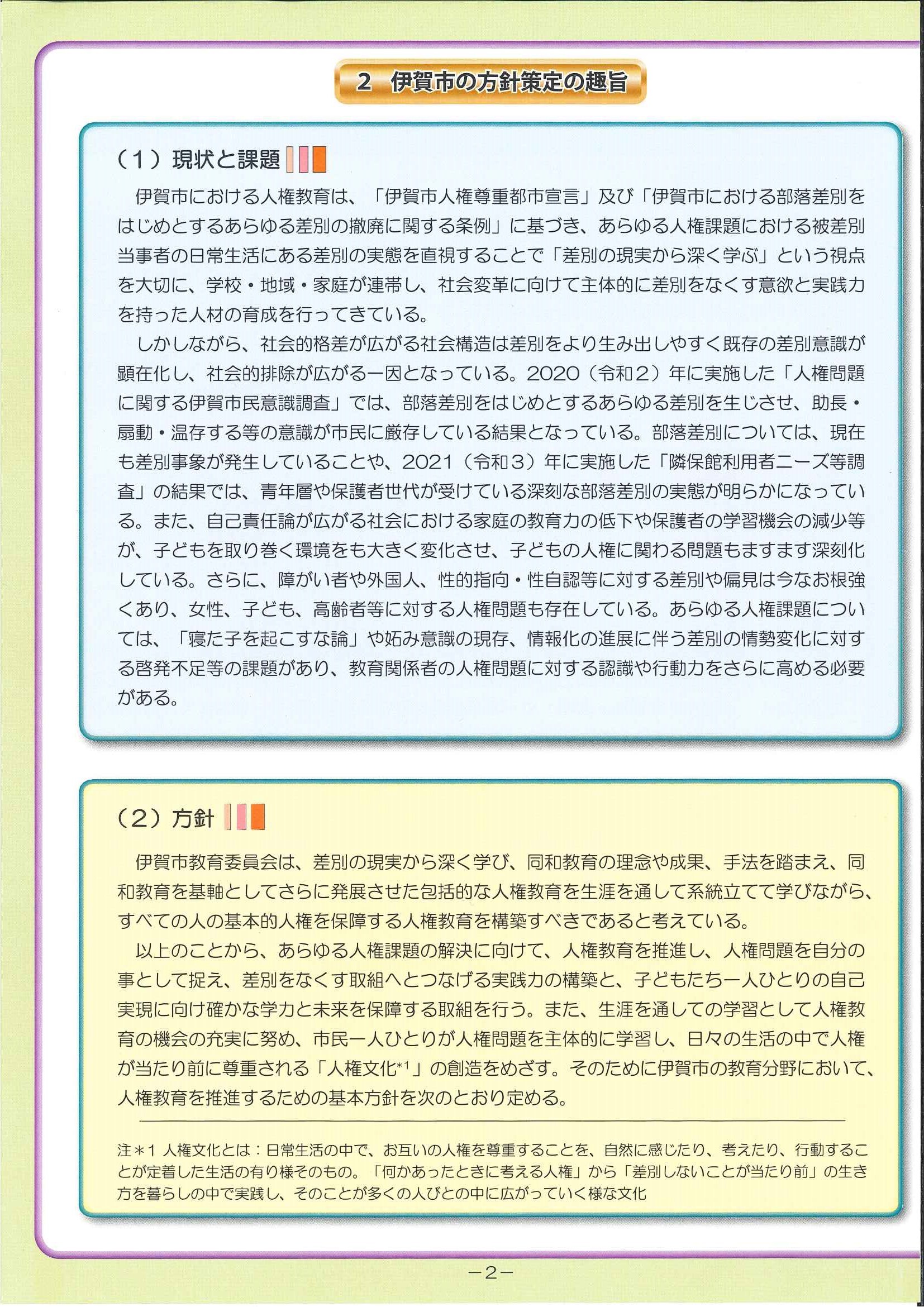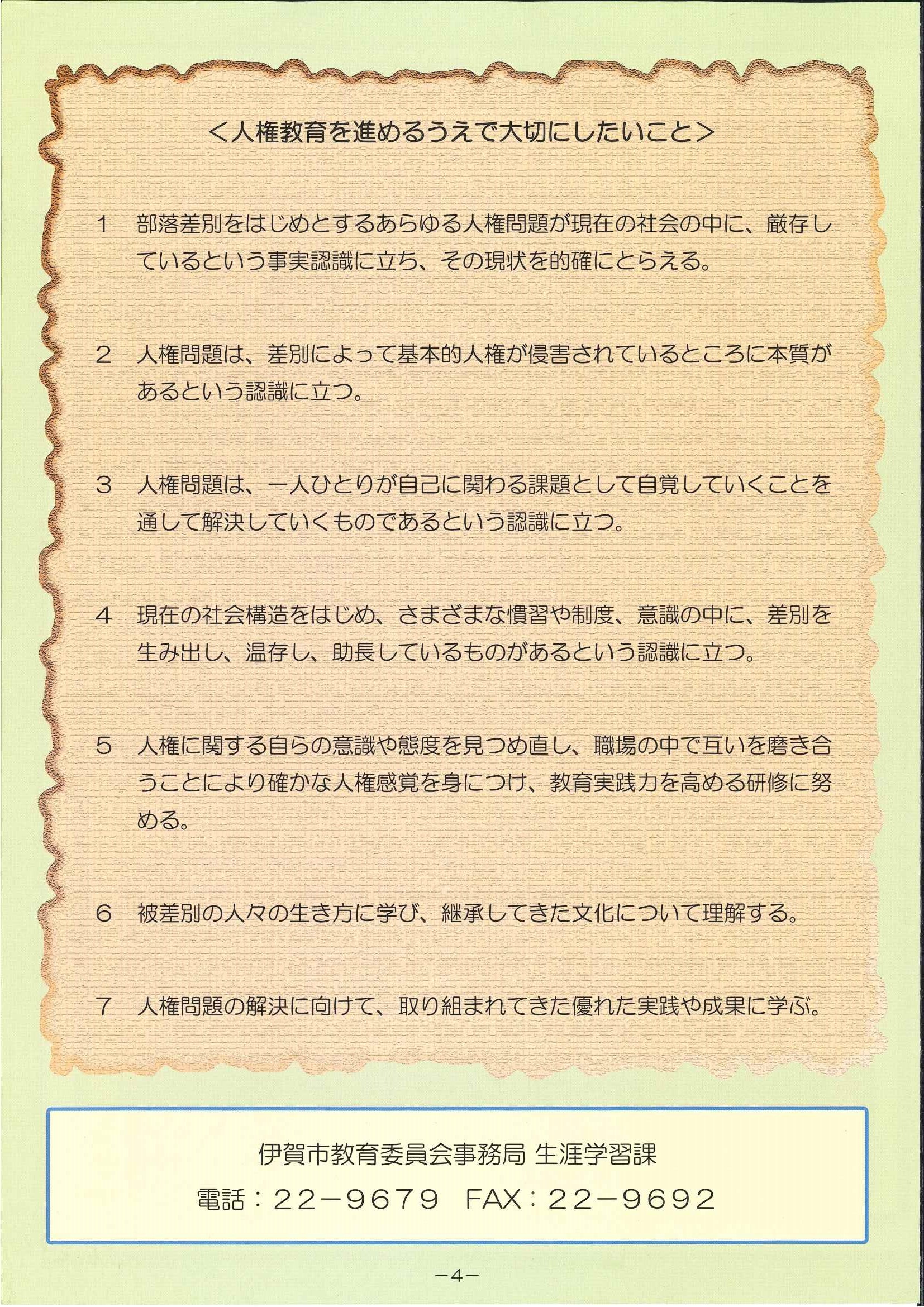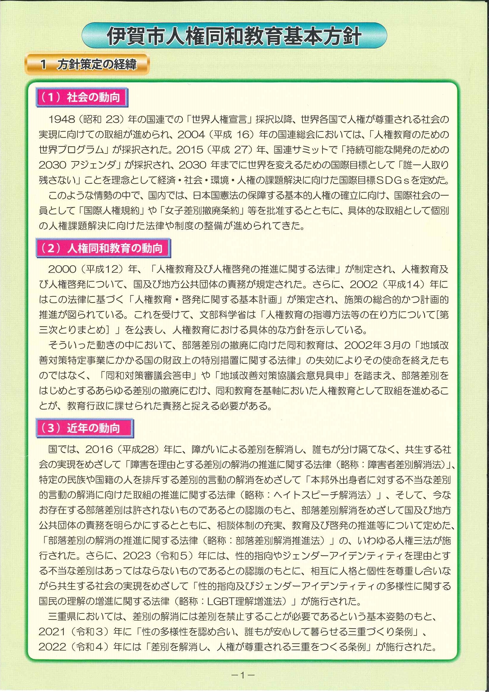 伊賀市教育委員会では、人権同和教育を総合的かつ効果的に推進するため、「伊賀市人権同和教育基本方針」を策定しています。この基本方針は、人権同和教育に関する市教育委員会の考え方・目的等を示したものです。