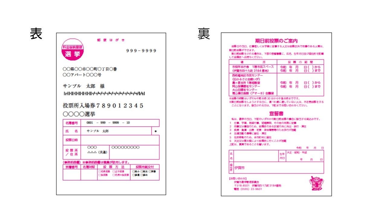 伊賀市の選挙人名簿に登録がある人に投票所入場券を送付します。投票所入場券があると投票がスムーズですので、投票所入場券を持って記載の投票所にお越しください。