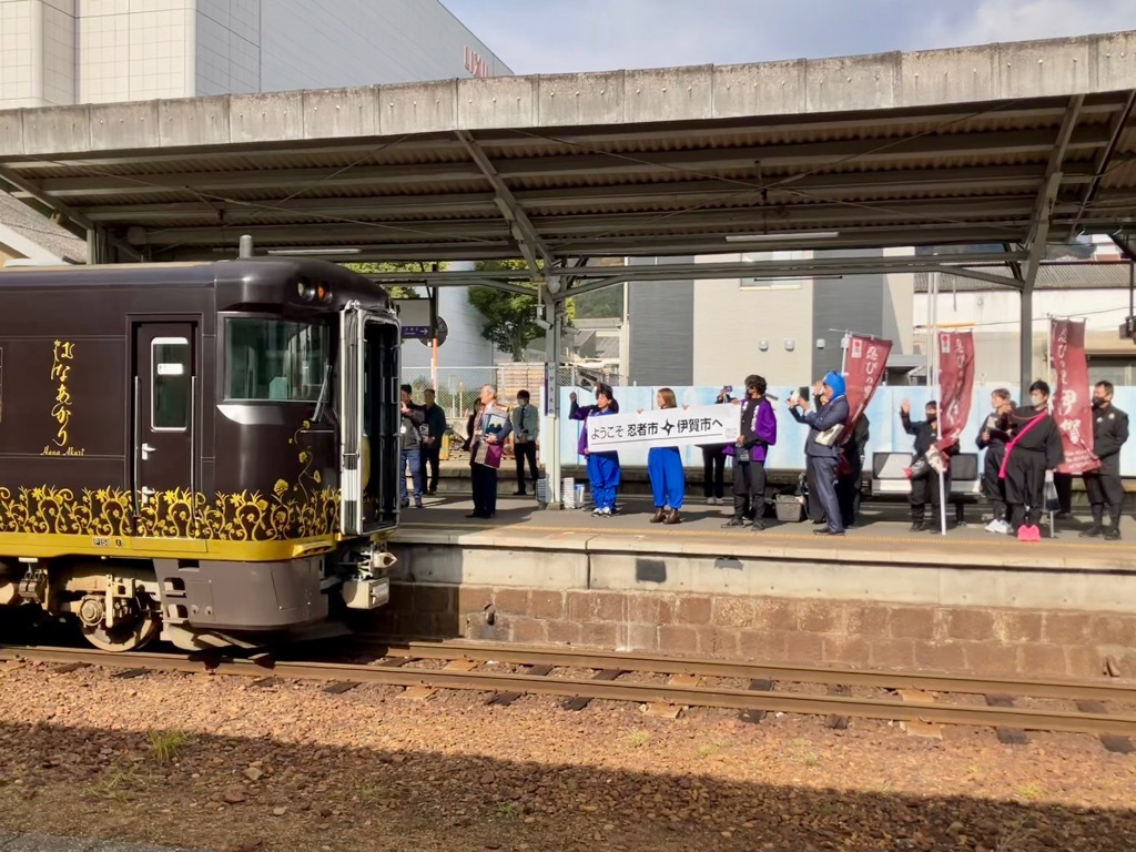 伊賀上野駅に停車する観光列車「はなあかり」