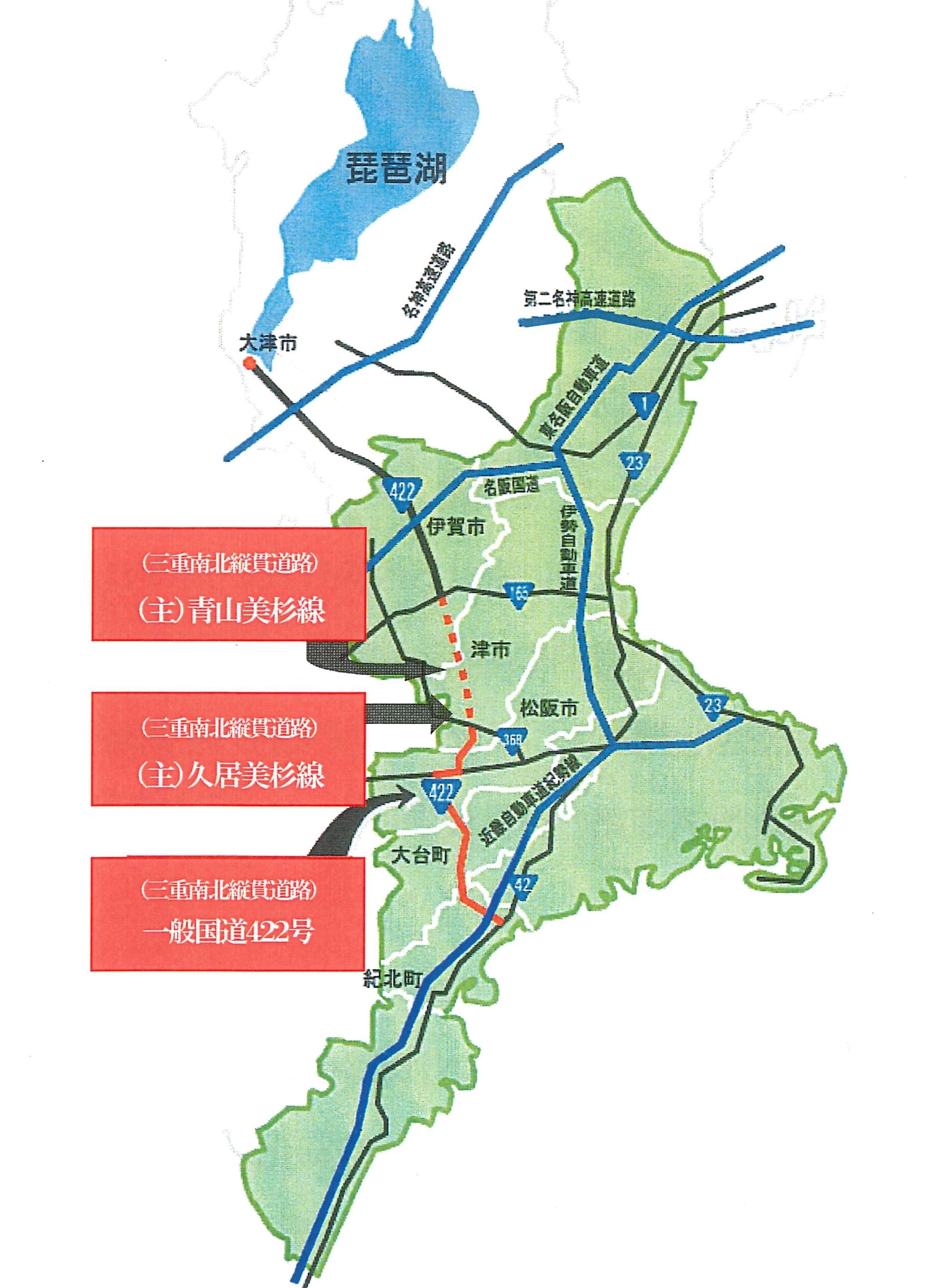 三重南北縦貫道路は、国道422号、県道青山美杉線、県道久居美杉線の結ぶ道路で、伊賀地域と東紀州地域を南北に縦貫する幹線道路です。この道路は、沿線に位置する5市町の農山漁村地帯と都市との間で産業・経済・文化などの広域交流をはじめ、世界遺産である熊野古道など東紀州地域の活性化を支援する重要な道路です。