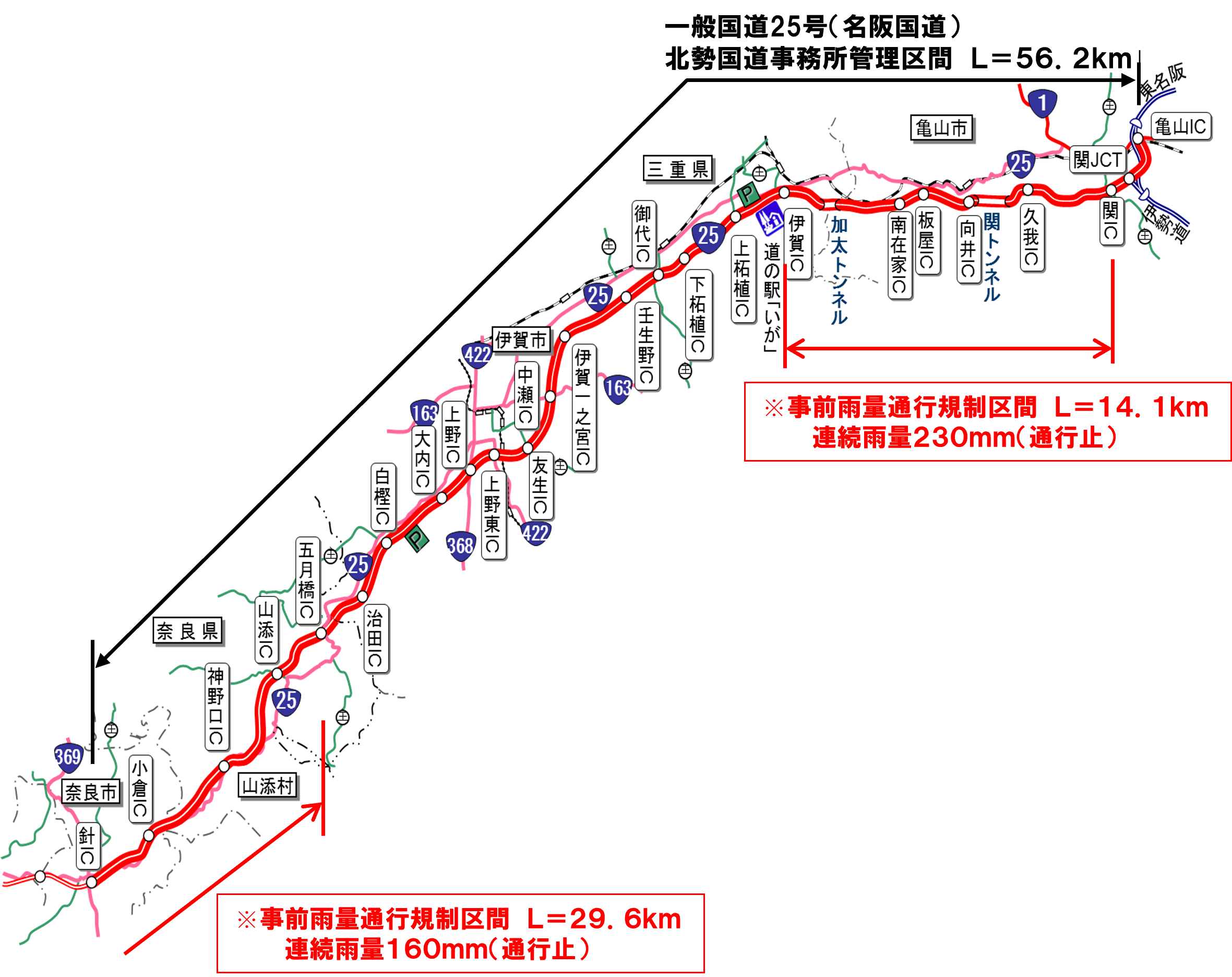 ・名阪国道関ICから伊賀IC間の雨量規制の解除及び安全性や利便性を確保するため、交通安全対策等を実施し、地域住民の安心や安全の確保すること。