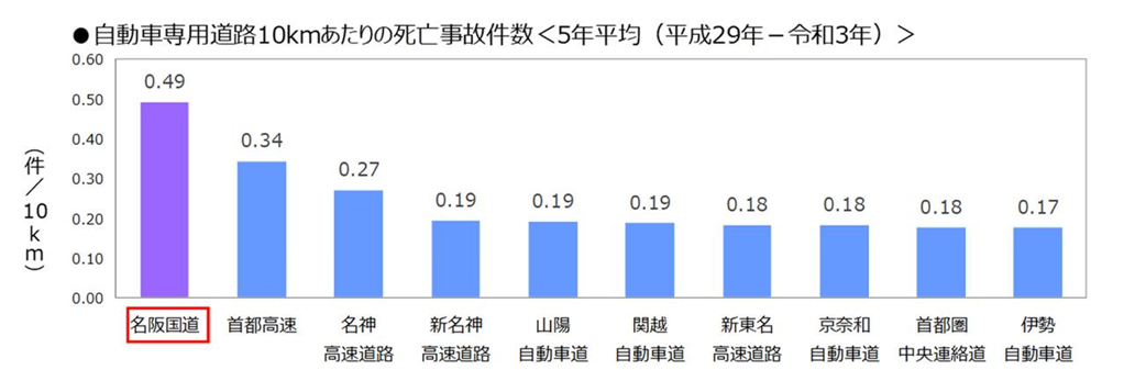 昭和40年12月に暫定2車線で開通し、令和7年12月には開通60周年を迎えます。高速道路網の整備途上であった歴史的な経緯から、短い工期で建設され、「千日道路」の異名もあります。非常に急な勾配と曲がりくねったカーブが連続することに加え、山間部特有の霧、雨、雪などの予測不能な気象条件により、玉突き事故などのリスクが高くなっています。その結果、自動車専用道路10km当たりの死亡事故件数(平成29年から令和3年までの5年平均)において、ワースト1となっています。