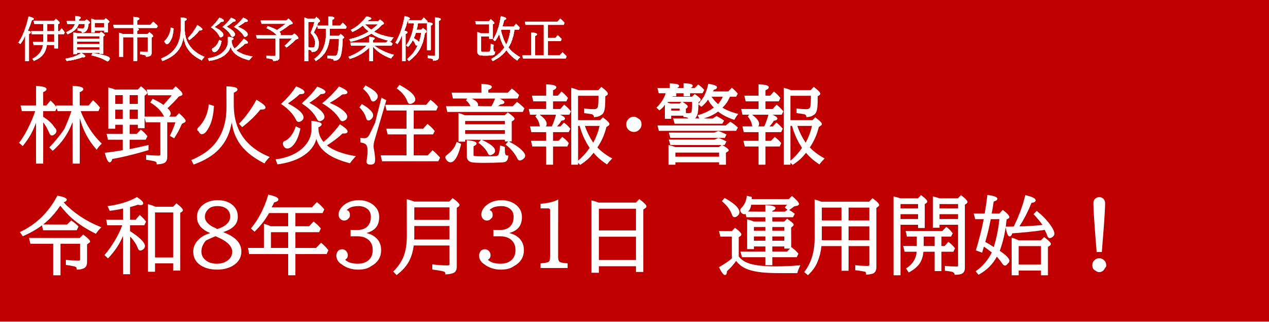 近年、全国で大規模な林野火災が数多く発生していることを受け、林野火災が発生しやすい気象条件が続く場合や、延焼拡大のおそれが高い状況において、住民の皆さまへ早期に注意喚起を行うことを目的として、伊賀市火災予防条例の一部が改正されました。これにより「林野火災注意報」及び「林野火災警報」を発令し、伊賀市内の屋外における「火の使用の制限」について新たに規定しました。