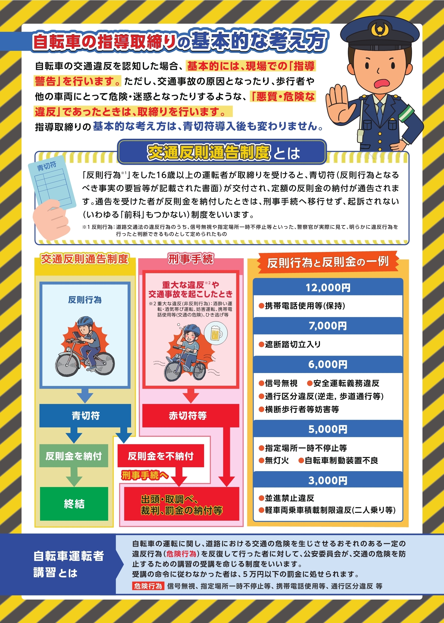 自転車の交通違反が認知された場合、基本的には、現場での「指導警告」が行われます。ただし、危険・迷惑となるような「悪質・危険な違反」であったときは、指導取締りが行われます。